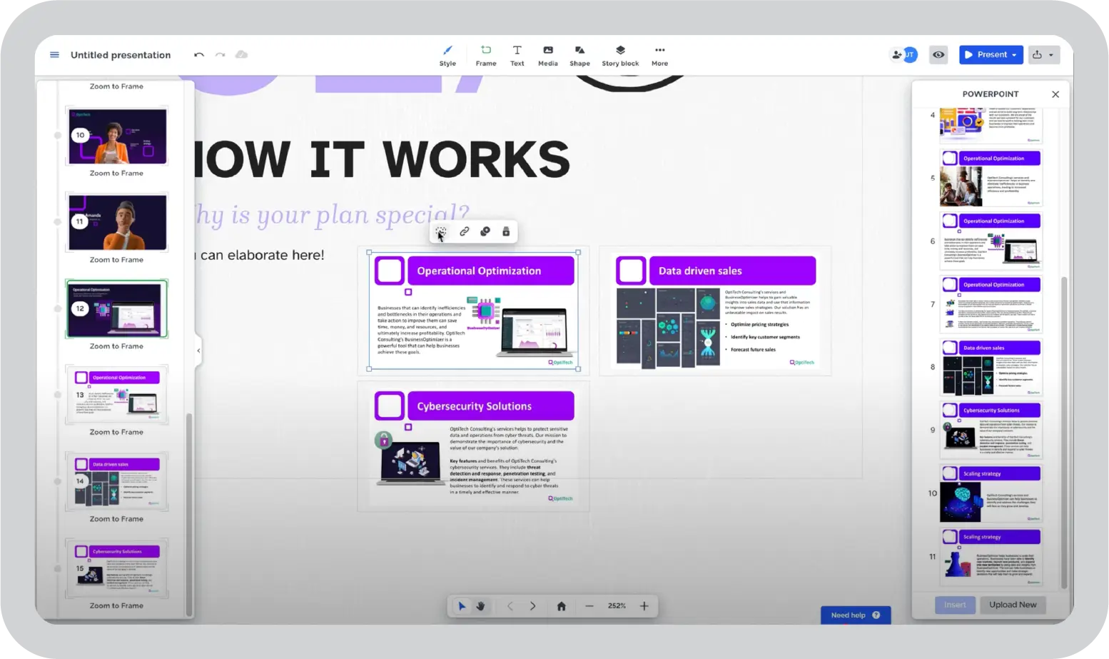 - 비선형 프리젠테이션 스타일:발표자가 아이디어를 시각적으로 연결하고 이야기 흐름을 통해 청중을 안내하는 데 도움이 되는 확대/축소 가능한 캔버스를 사용합니다.