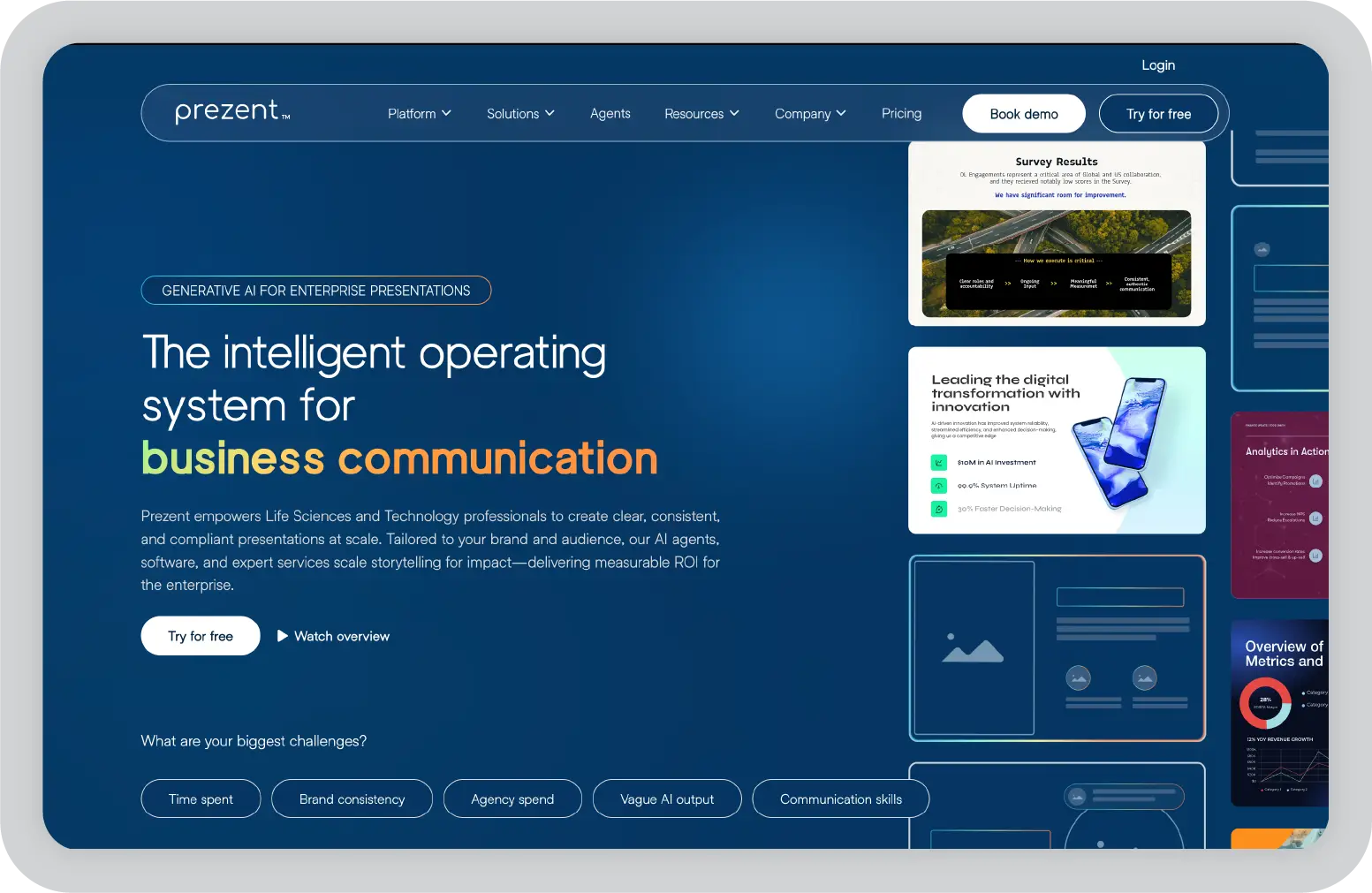프레지은 기존의 슬라이드별 스토리텔링을 뛰어넘는 역동적인 비선형 형식으로 잘 알려진 프레젠테이션 플랫폼입니다. 확대/축소 인터페이스를 통해 발표자는 시각적 캔버스를 탐색하여 더욱 영화적이고 상호 작용적인 경험을 만들 수 있습니다. Prezi는 체계적인 기업 프레젠테이션보다는 매력적이고 스토리 중심의 프레젠테이션을 전달하려는 사용자를 위해 설계되었습니다.